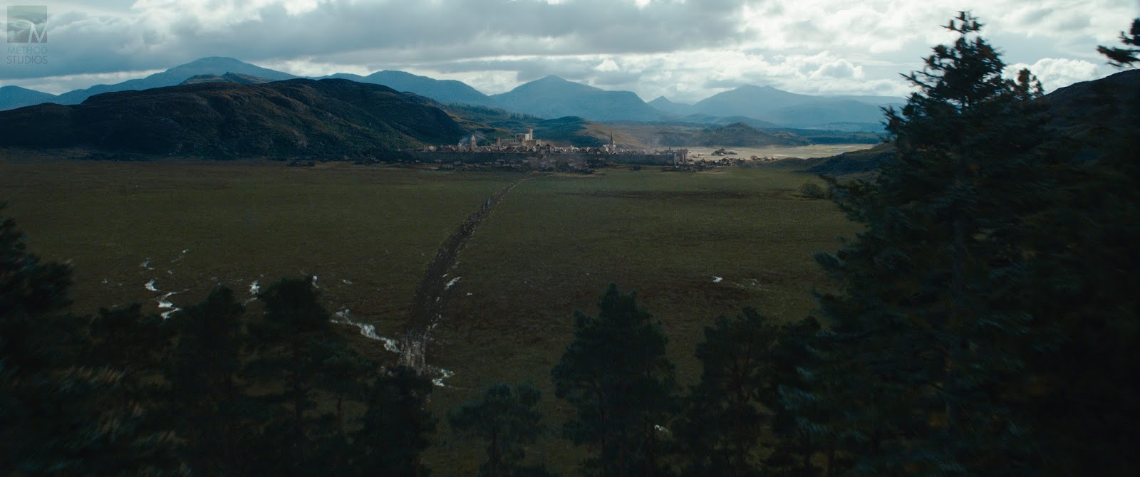 One of the matte paintings I had a chance to work on during Outlaw King project. Fantastic plate to start with however presented some challenges. For one we had to remove all modern trees introduced to Scotland in recent times - those included all pines which covered pretty much 80% of the mountains to the left and right hand side in shot. On top of that Perth was added which included parts of rendered 3d assets as well custom made elements in Photoshop. I also had to create the mud road as well as 3d bridge visible in the foreground. In the second image I indicate areas I had to work with ( added in matte painting stage ). VFX sup - Dan Bethell